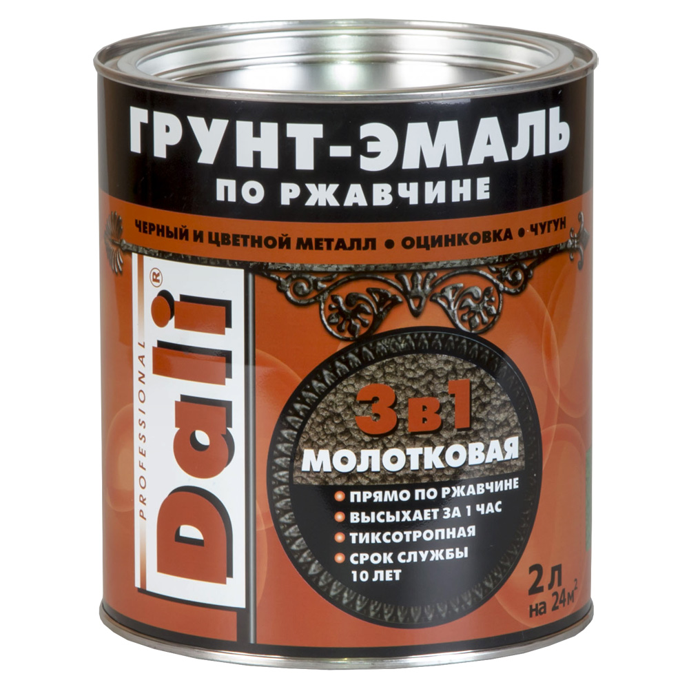 Грунт-эмаль (краска) Dali по ржавчине «3 в 1» предназначена для самостоятельного окрашивания как новых, так и пораженных точечной или сплошной коррозией металлических поверхностей с толщиной ржавчины до 100 мкм., плотно сцепленной с металлом. Краска по ржавчине может применяться как для неокрашенных, так и ранее окрашенных (ПФ, ГФ, Кузбасслак, МА, МД) чугунных и стальных поверхностей.