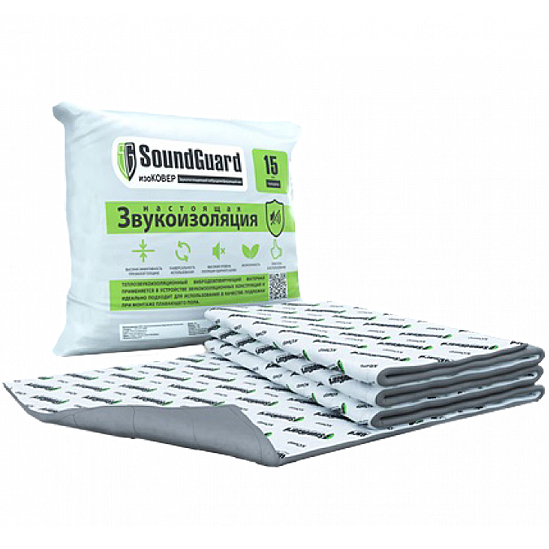 SoundGuard ИзоКОВЕР - это вибро-, звукоизоляционный материал, состоящий из иглопробивного стекловолокнистого холста, спрессованного механическим способом, запаянный в защитную оболочку из спанбонда. Применяется в помещениях разного типа и назначения: при звукоизоляции полов - в качестве упругой вибродемпфирующей прокладки под стяжкой; в конструкции звукоизоляции стен и потолков - в качестве амортизирующего и шумопоглощающего слоя; в межэтажных перекрытиях - для ослабления конструкционного шума.